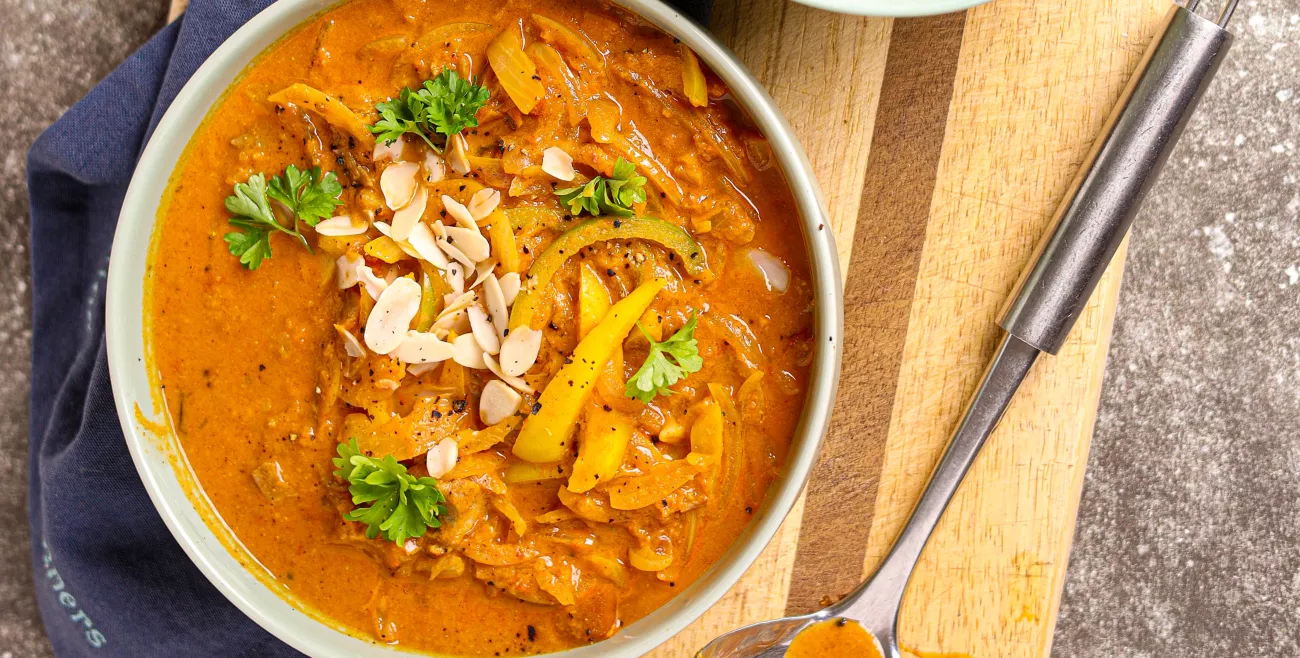 Cordero deshuesado con tomate, anacardo cebolla y nata con especias tradicionales.